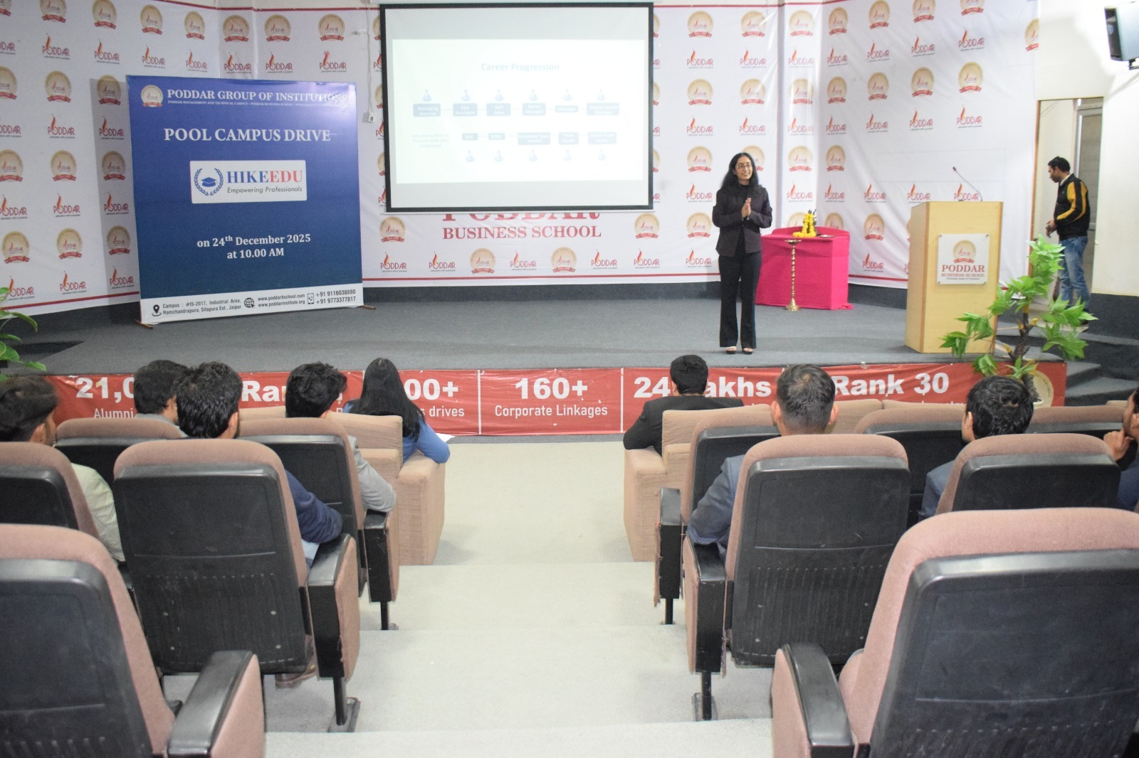 Poddar Group of Institutions successfully organized a Pool Campus Placement Drive at our Jaipur campus, in collaboration with HikeEdu – Empowering Professionals. The drive saw enthusiastic participation from final-year students across management and technical programs. The structured recruitment enabled students to confidently showcase their skills, knowledge, and professional readiness. This placement drive proved to be a meaningful platform for students to engage with industry professionals and experience live recruitment processes. Such initiatives reflect Poddar Group of Institutions’ continued commitment to bridging the academia–industry gap, enhancing employability, and supporting students in achieving their career goals.