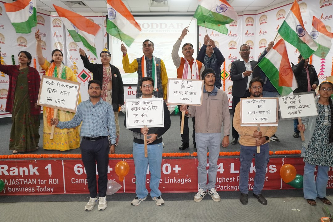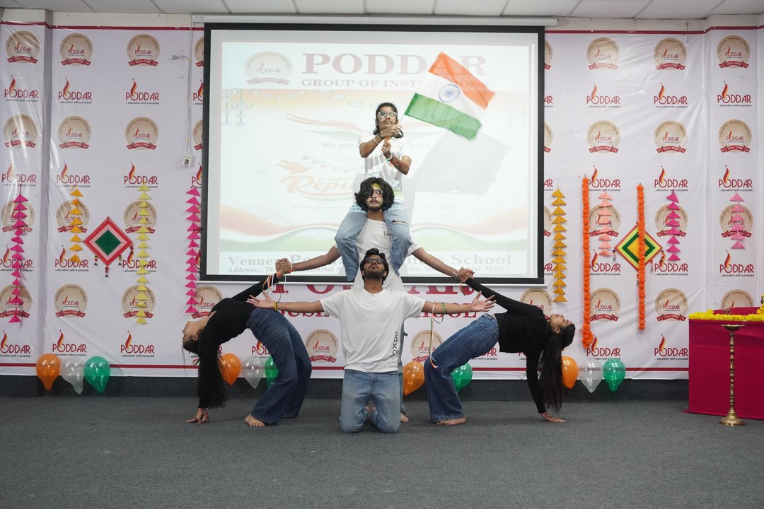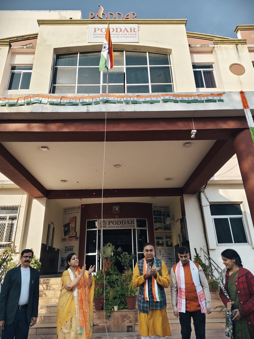 The Poddar Group of Institutions proudly celebrated the 77th Republic Day with great enthusiasm, patriotism, and unity. The campus was beautifully decorated in the tricolour, reflecting the spirit of the nation. The celebration began with the hoisting of the national flag, followed by the National Anthem, filling everyone with pride and respect. Students and faculty members participated in cultural performances, patriotic songs, and speeches highlighting the values of the Indian Constitution. The event inspired students to uphold democratic ideals, social responsibility, and national integrity. The celebration concluded with a message of unity, progress, and commitment towards building a stronger and self-reliant India.