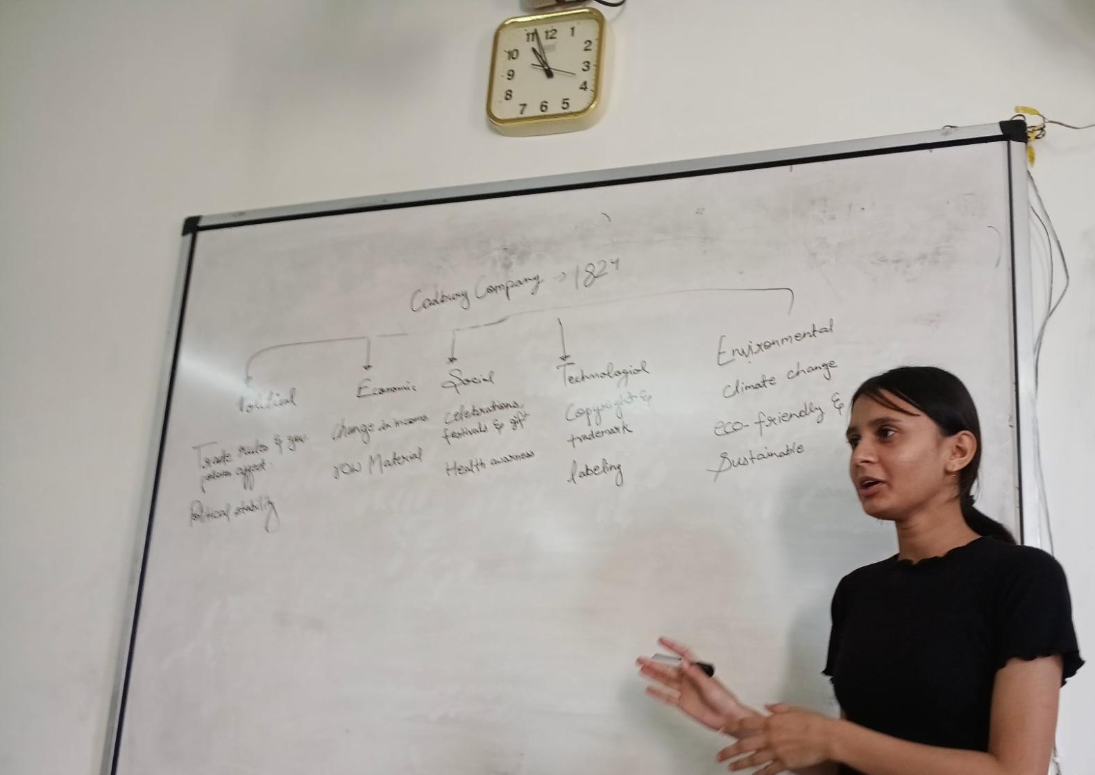 The "Department of Commerce & Management" at Poddar International College organized an engaging classroom activity on “Applied Learning through PESTLE Analysis of Indian & Global Brands” for BBA Semester-III students under the guidance of Ms. Charushi Jain. The activity conducted on 23rd, 24th, 25th September & 4th October 2025, which allowed students to analyze brands like Amul, Bisleri, Nykaa, Reliance Jio, Zudio, Meesho, Cadbury, Dream11, Boat, Bikaji, Fevicol, Tencent Games, and more through PESTLE Analysis.